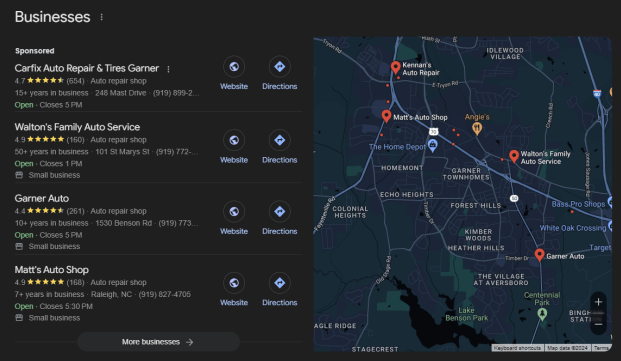 screenshot of Google Business Profile Map Pack for Auto Repair search results